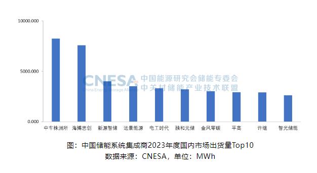 2023年,国内市场中,储能系统出货量排名前十的中国企业,依次为:中车株洲所、海博思创、新源智储、远景能源、电工时代、融和元储、金风零碳、平高、许继和智光储能。
