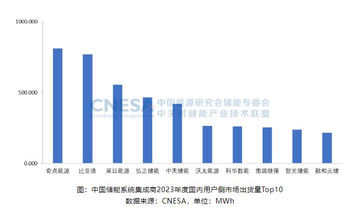 2023年,国内用户侧市场中,储能系统出货量排名前十的中国企业,依次为:奇点能源、比亚迪、采日能源、弘正储能、中天储能、沃太能源、科华数能、南瑞继保、智光储能和融和元储。