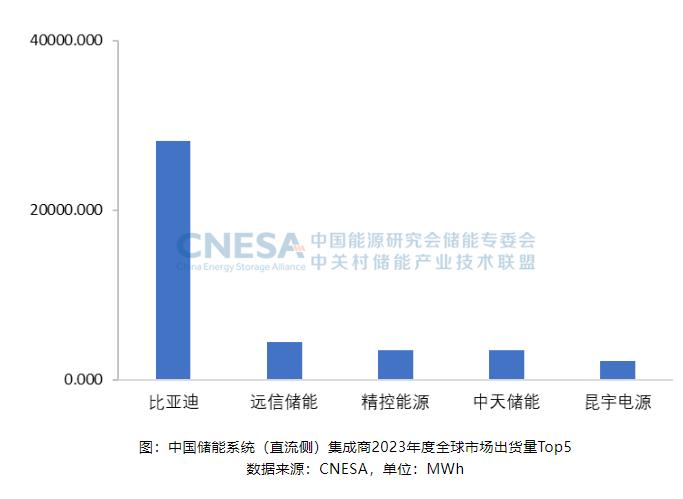 2023年,全球市场中,储能系统(直流侧)出货量排名前五位的中国企业,依次为:比亚迪、远信储能、精控能源、中天储能和昆宇电源。