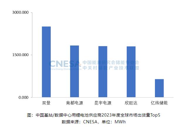 2023年,全球市场中,基站/数据雷速官方网页版用锂电池出货量排名前五位的中国企业,依次为:双登、南都电源、昆宇电源、欣旺达和亿纬储能。